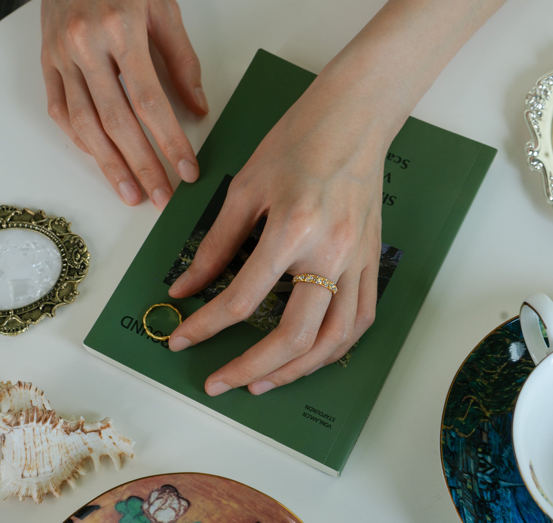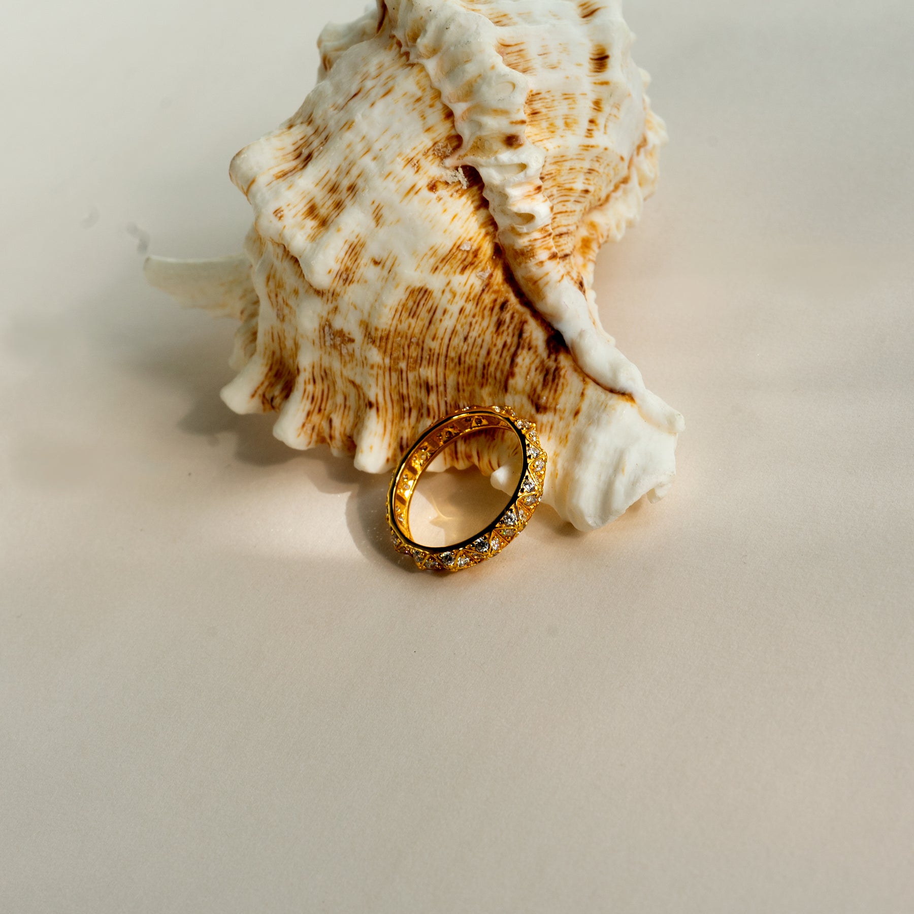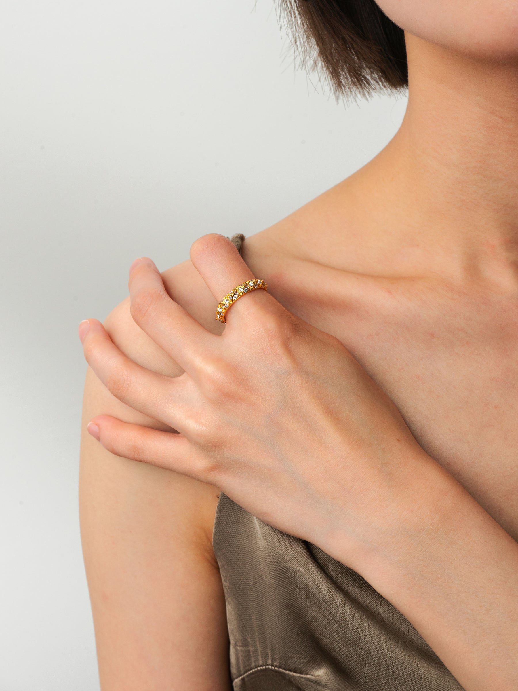 The Golden Grid Ring features a gold-tone base with an orderly arrangement of square patterns, with cubic zirconia delicately set within. The unique geometric design offers a blend of fashion and refinement, making it both modern and sophisticated.