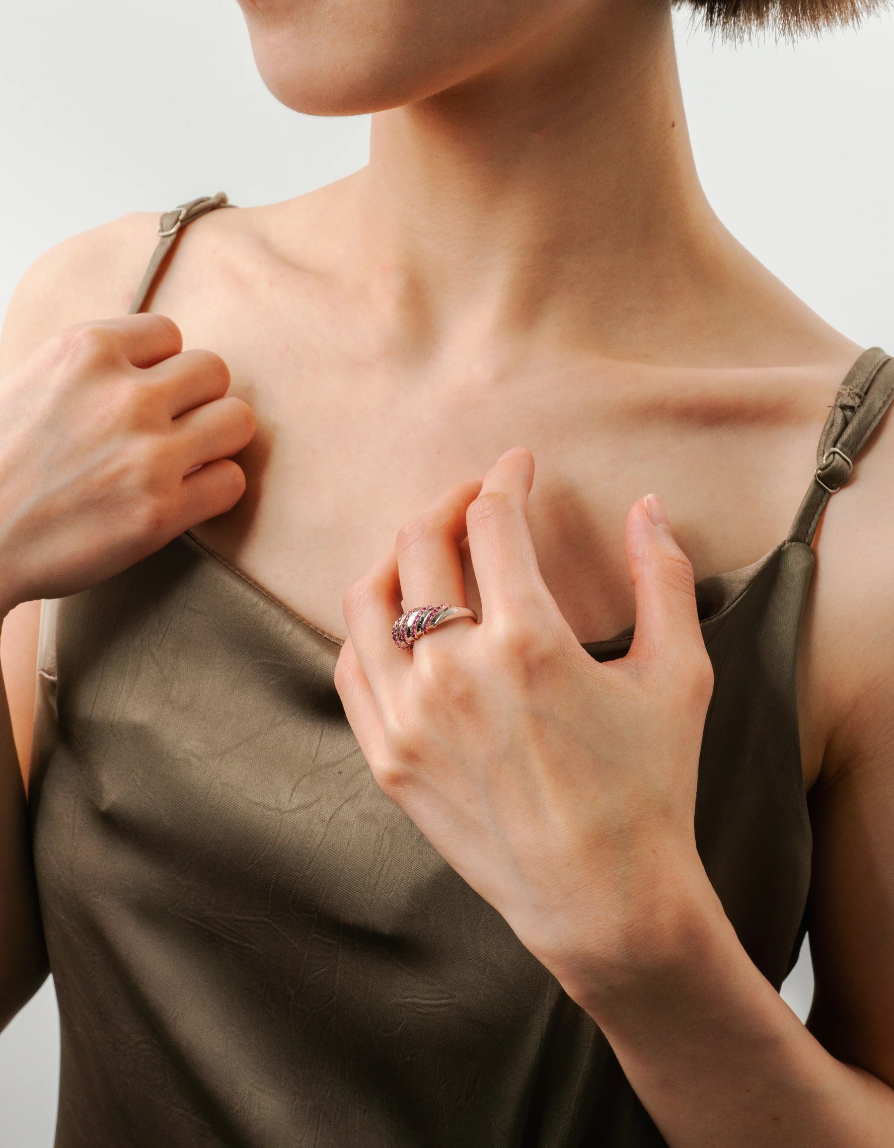 Inspired by swirling lines and delicate pink gemstones, this ring evokes the soft, intoxicating flow of rosé wine.