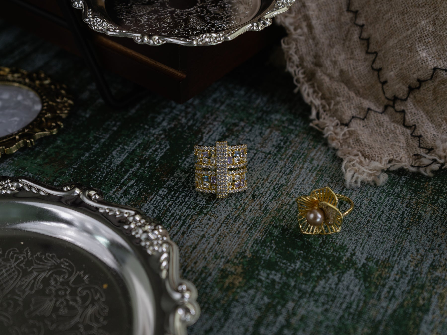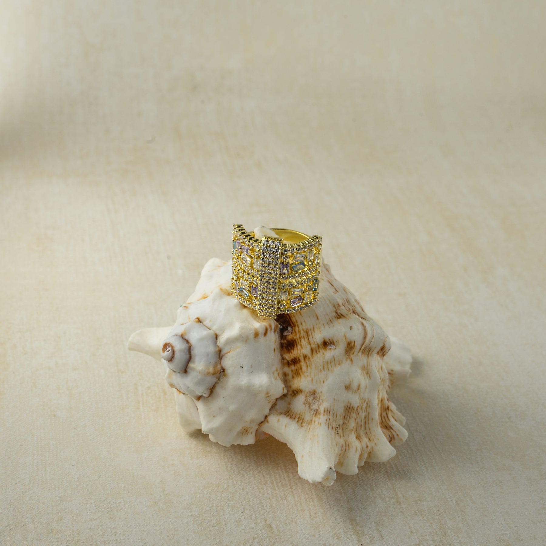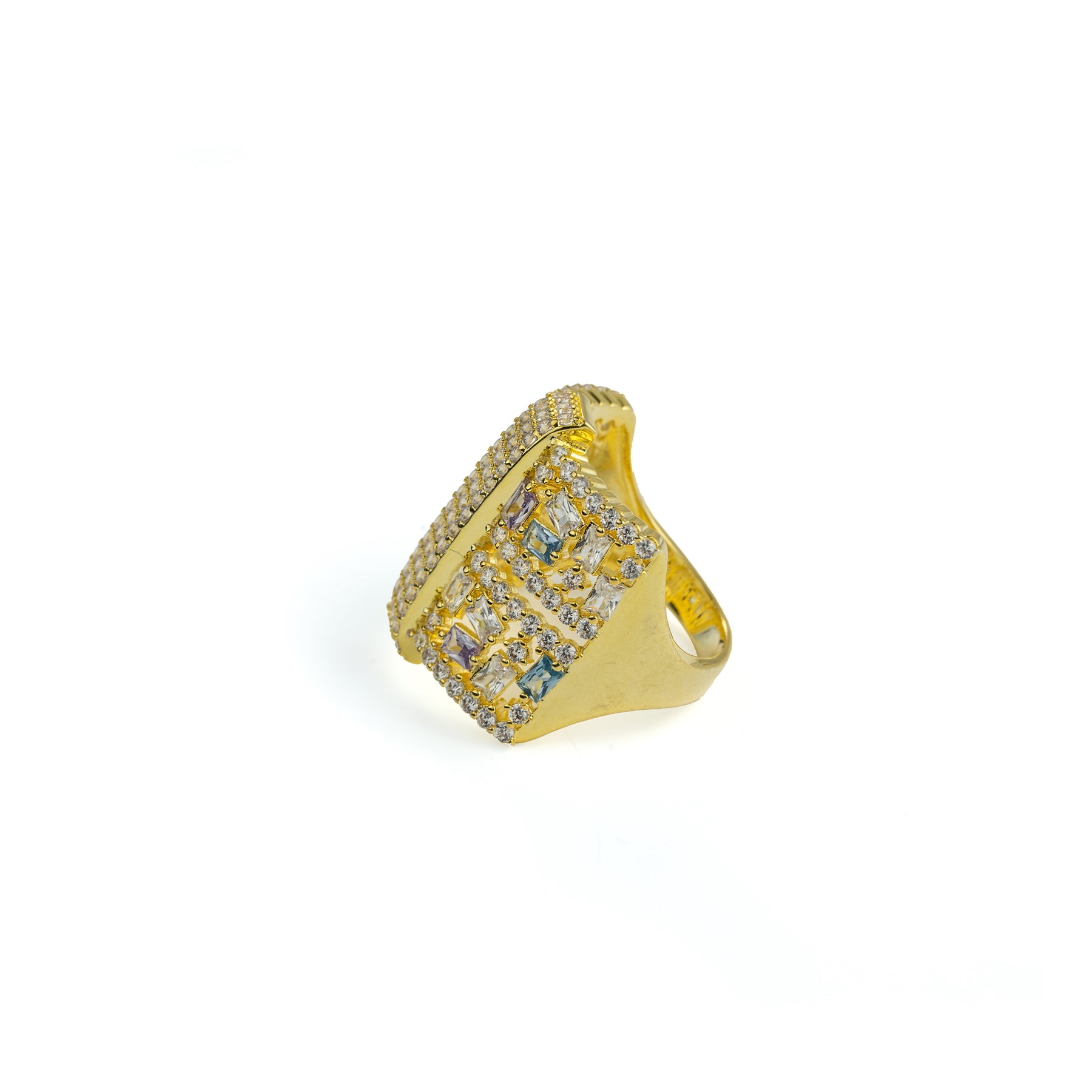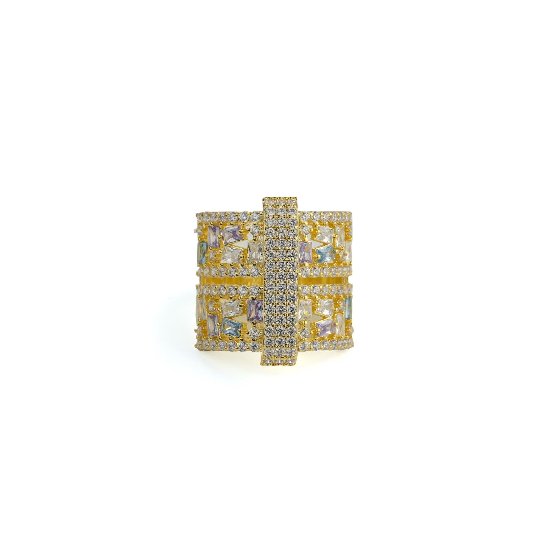 This ring makes a bold statement with its striking geometric design and dazzling array of white gemstones. Multiple layers of interwoven lines are set with various cuts of brilliant white stones, creating a stunning display of light and sparkle. Crafted from comfortable 18K gold-plated brass, it's the perfect choice for those who appreciate modern elegance.