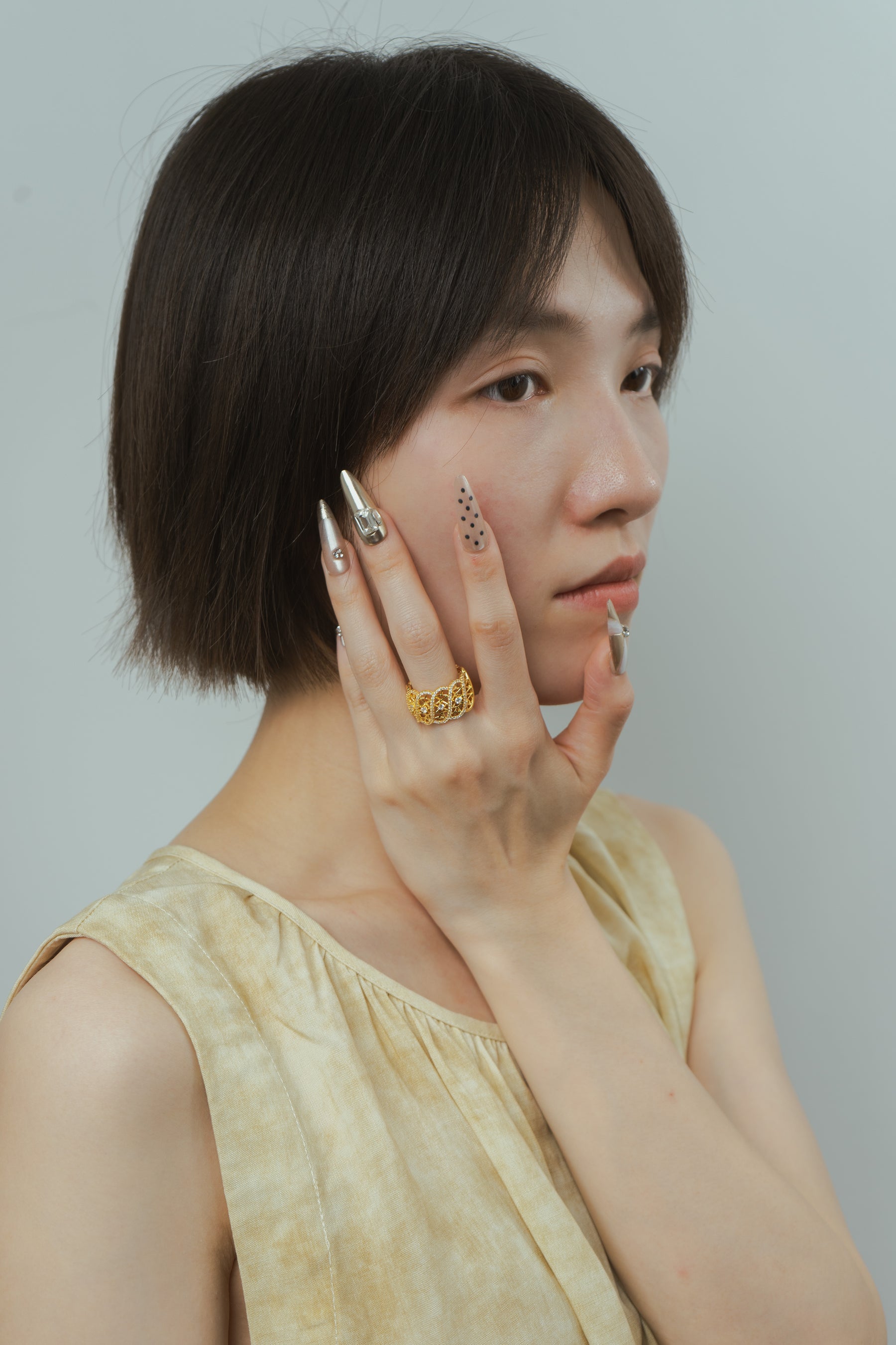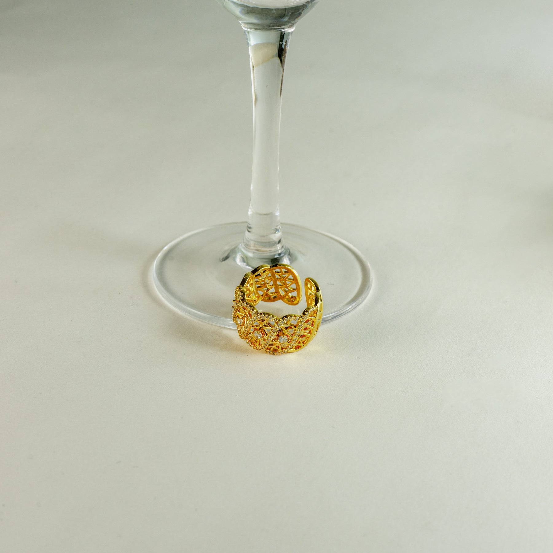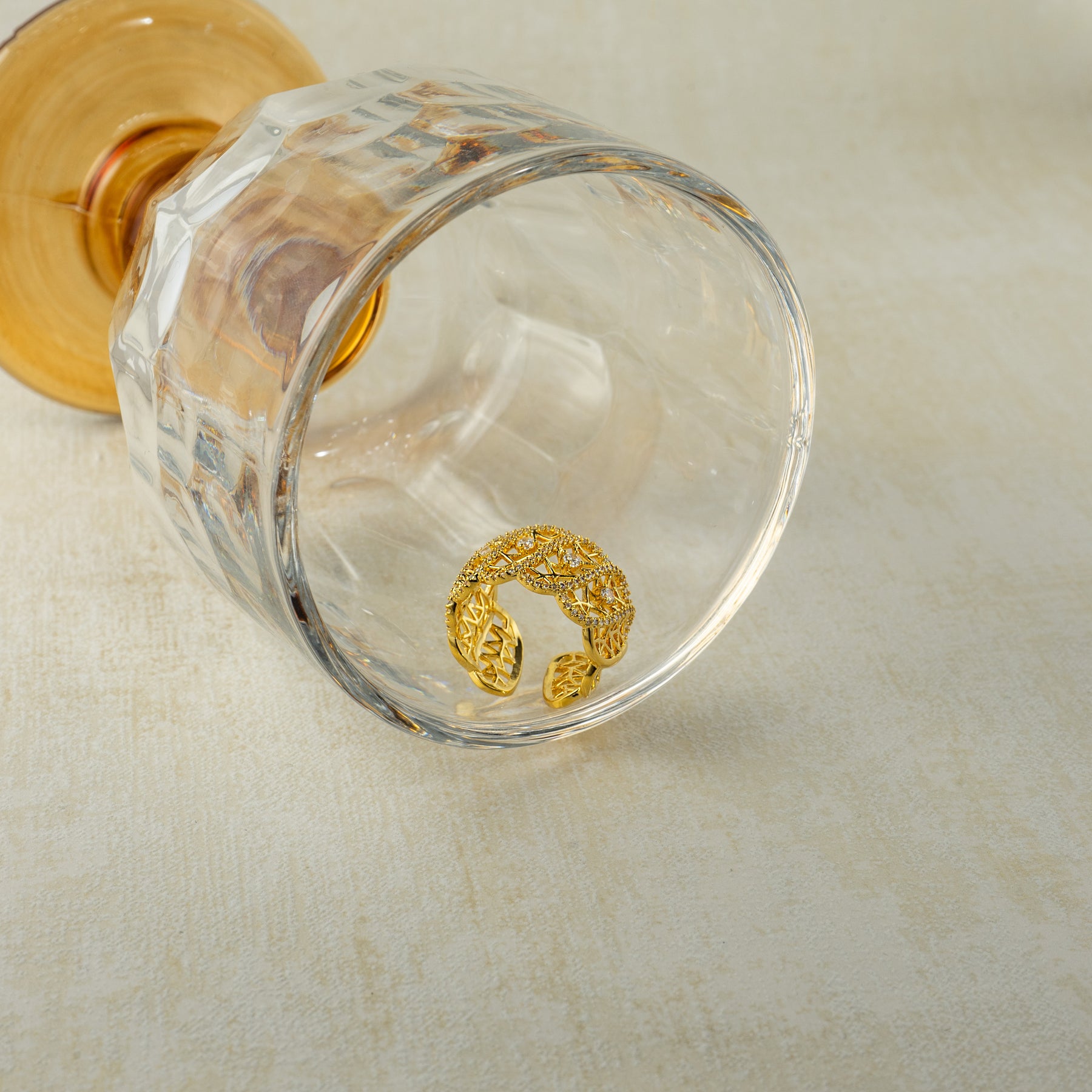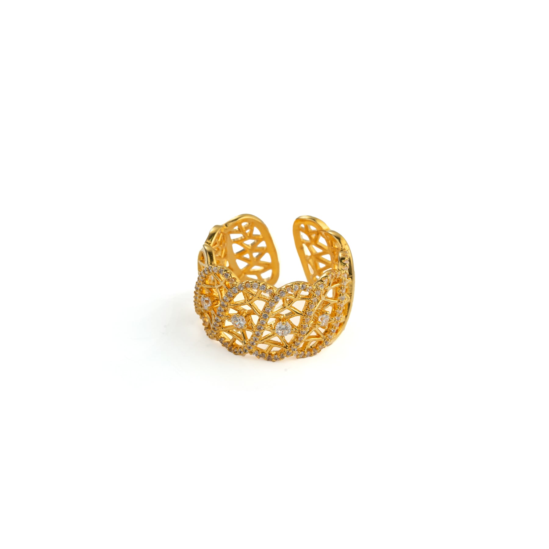 A celebration of clean lines and modern elegance. This ring features a sophisticated geometric design, meticulously crafted from 18K gold-plated brass and accented with sparkling cubic zirconia. Comfortable to wear every day, it adds a touch of contemporary chic to any ensemble.