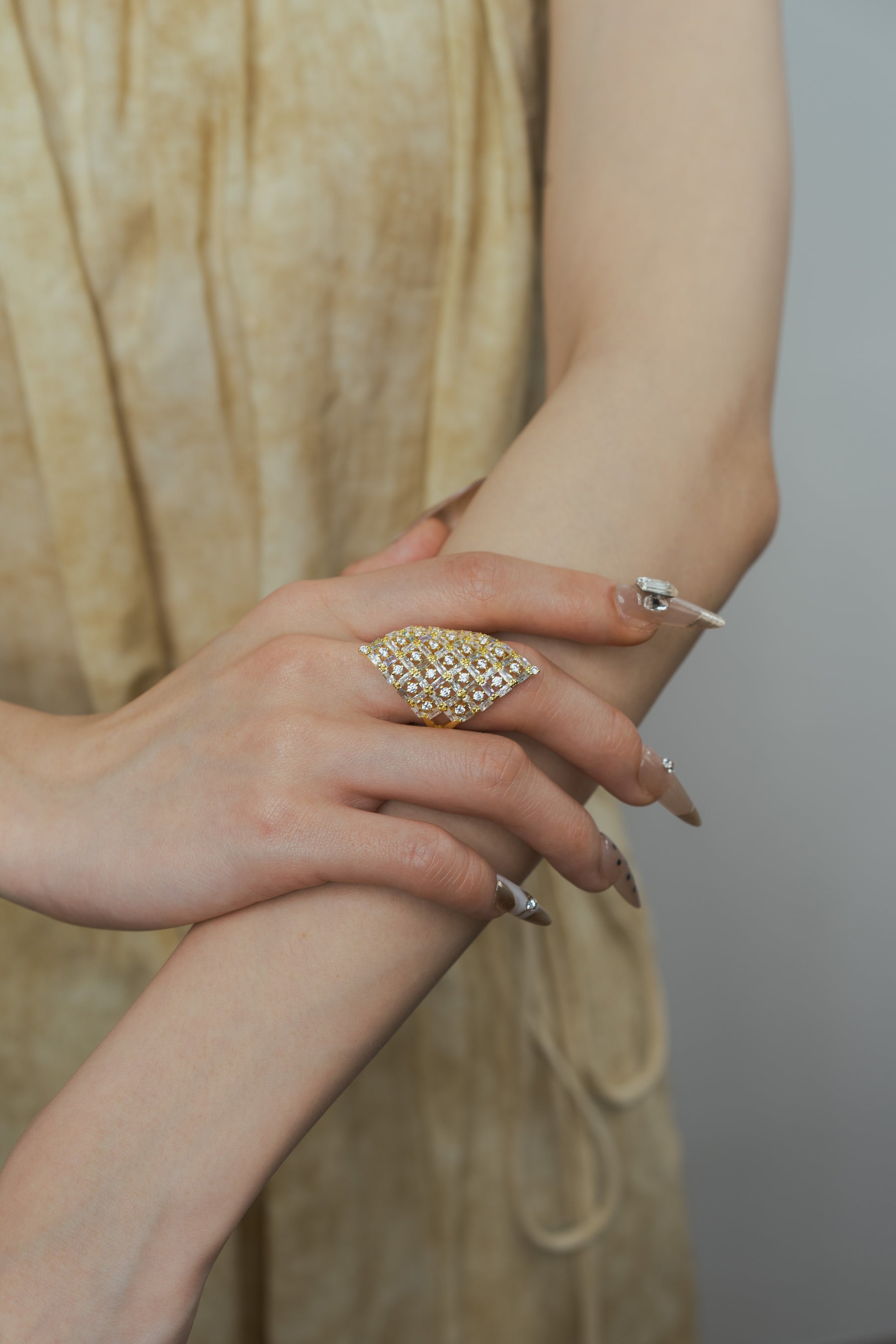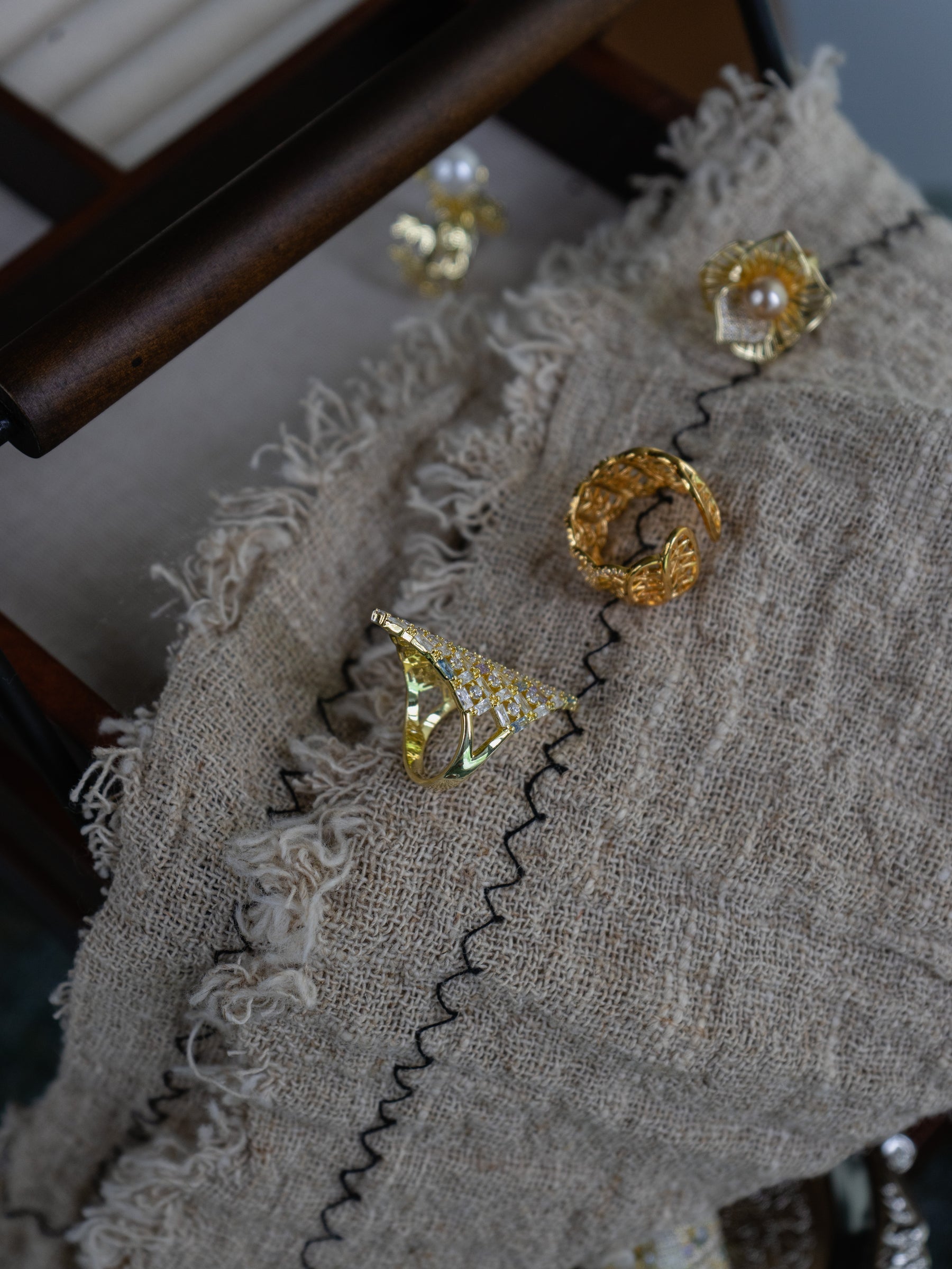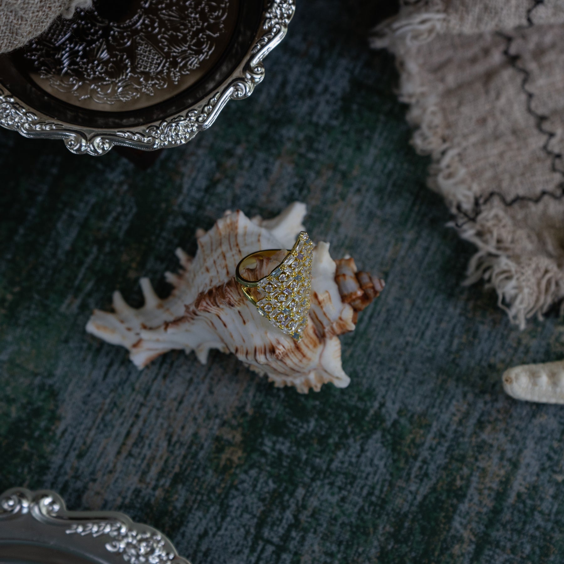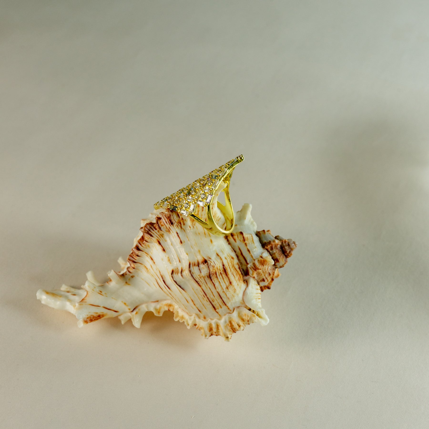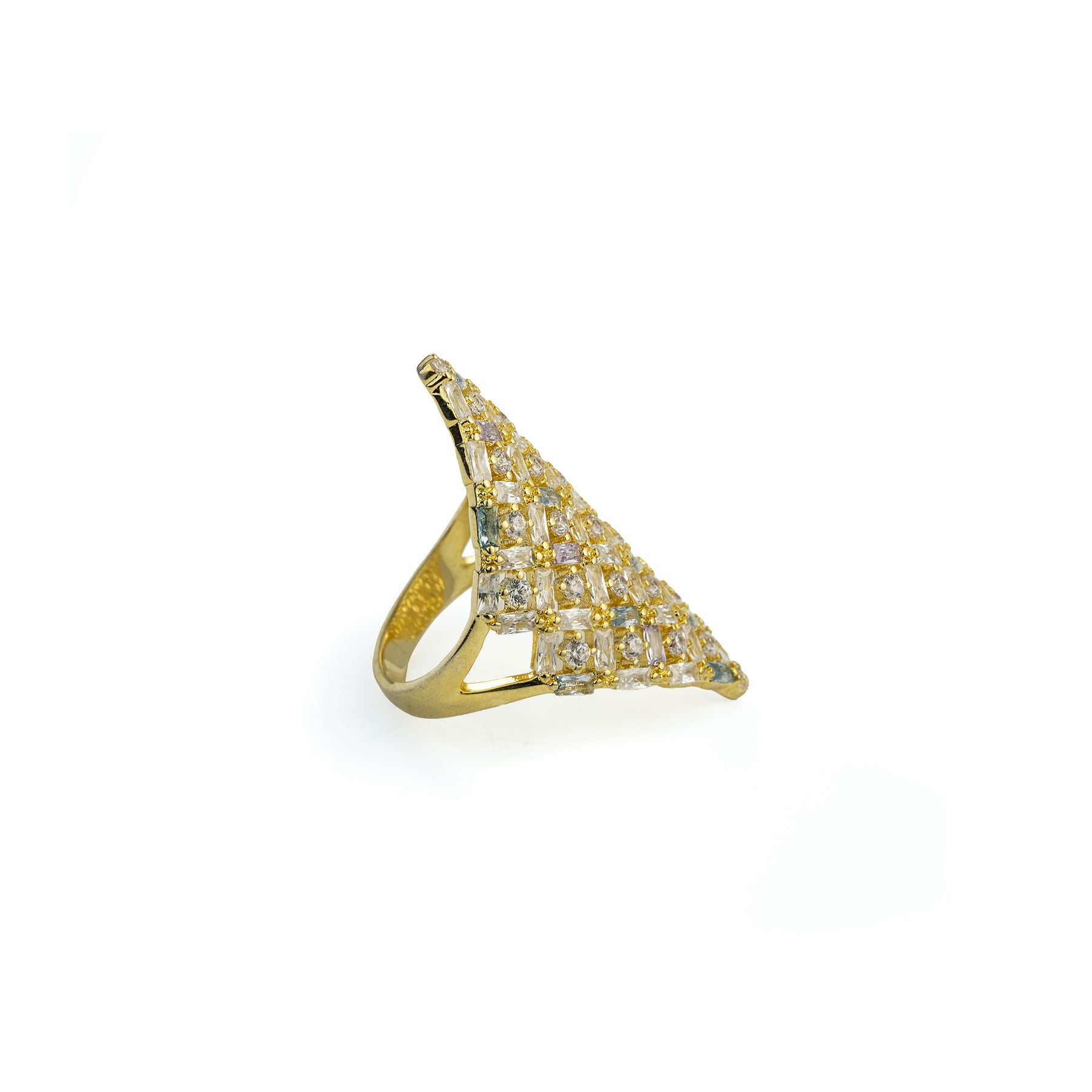 A celebration of nature's elegance. This ring's unique leaf-shaped design is beautifully accented with multicolored cubic zirconia, creating a captivating interplay of light and color. Crafted from 18K gold-plated brass.