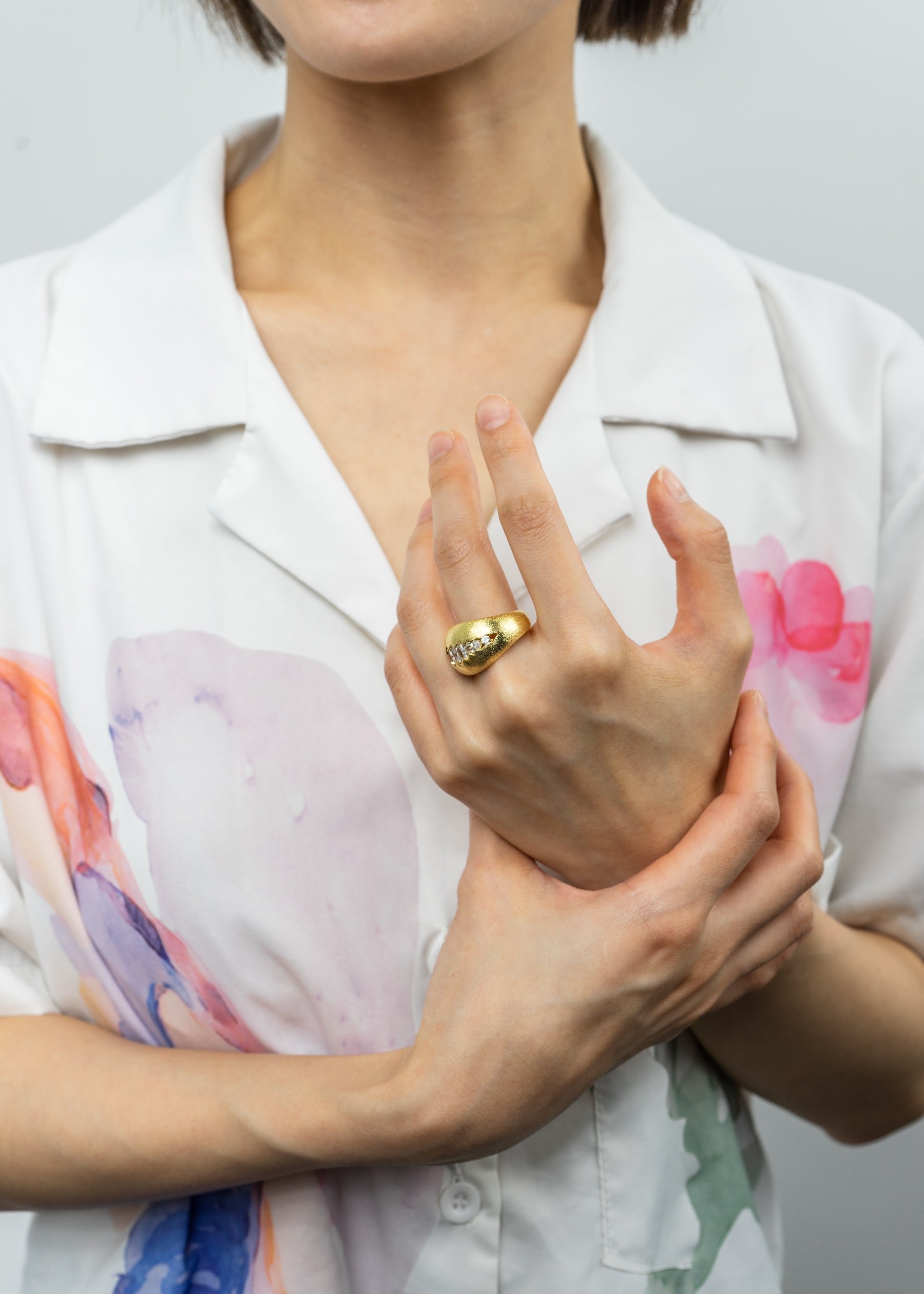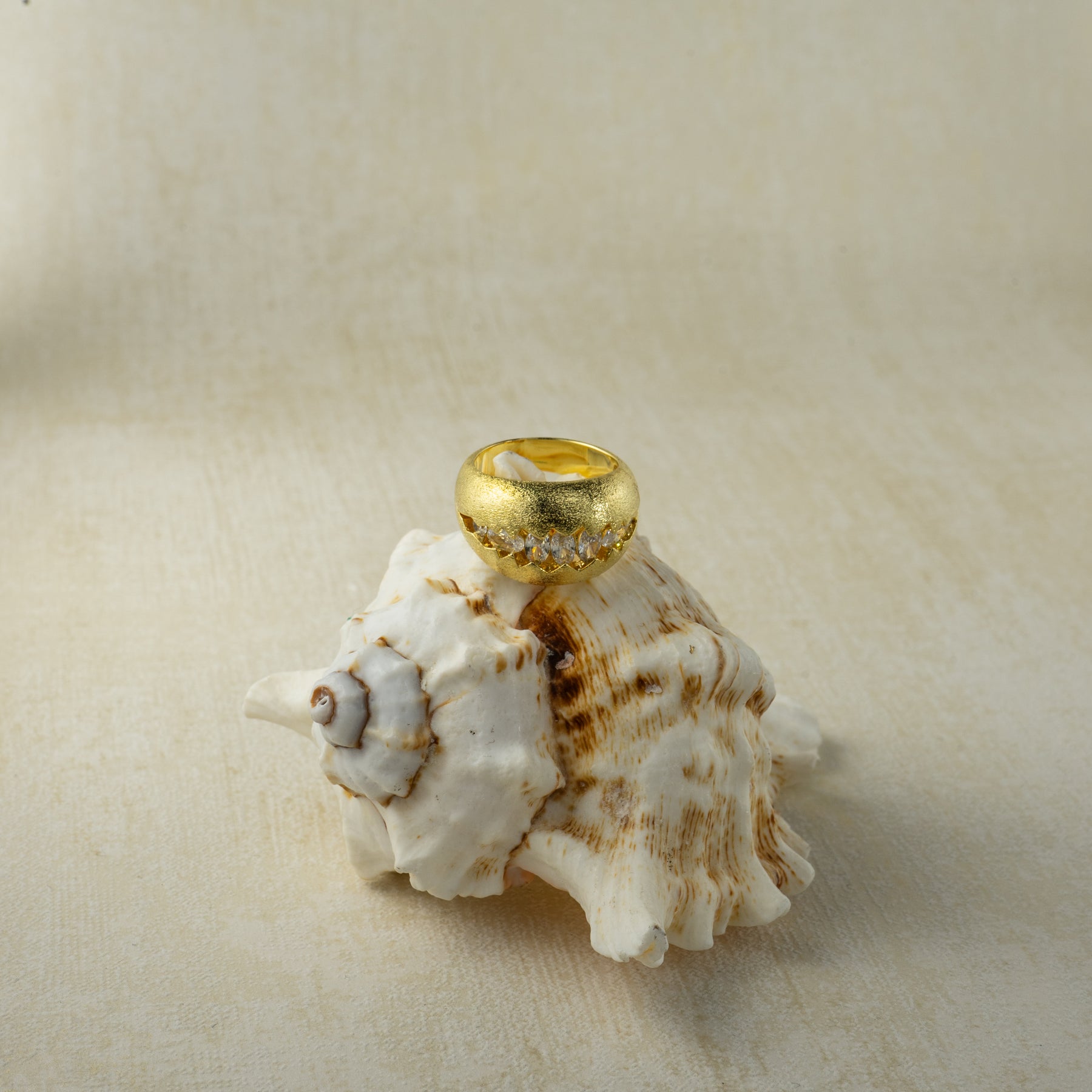 A modern design statement featuring a unique fissure that adds depth and intrigue. Crafted from 18K gold-plated brass with a brushed finish, this ring is accented with a line of sparkling cubic zirconia, creating a play of light and shadow.