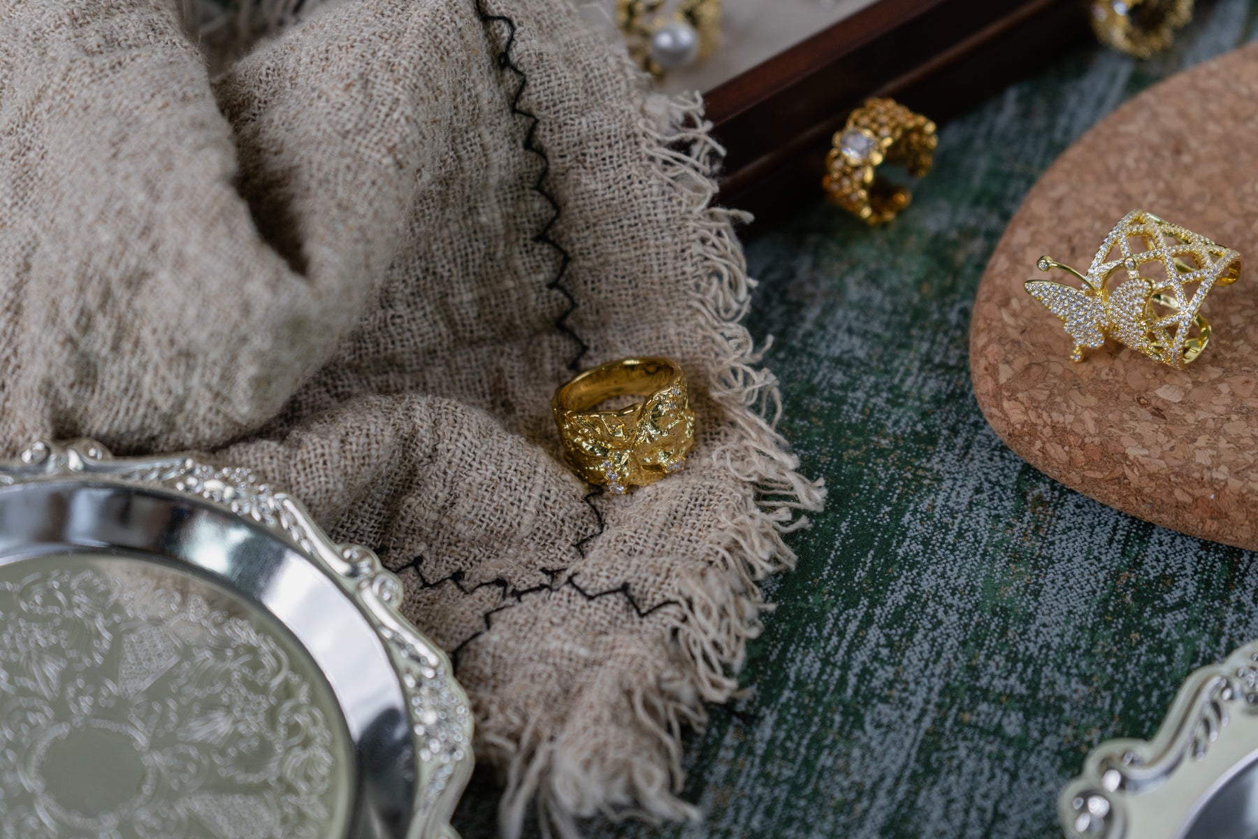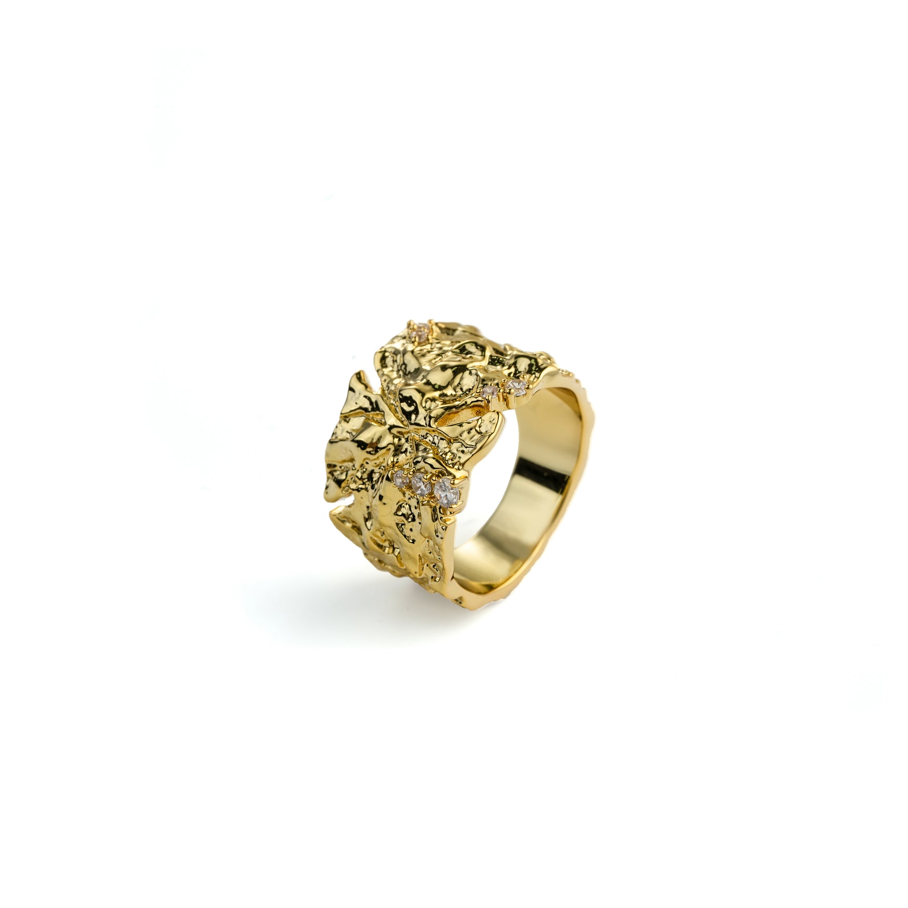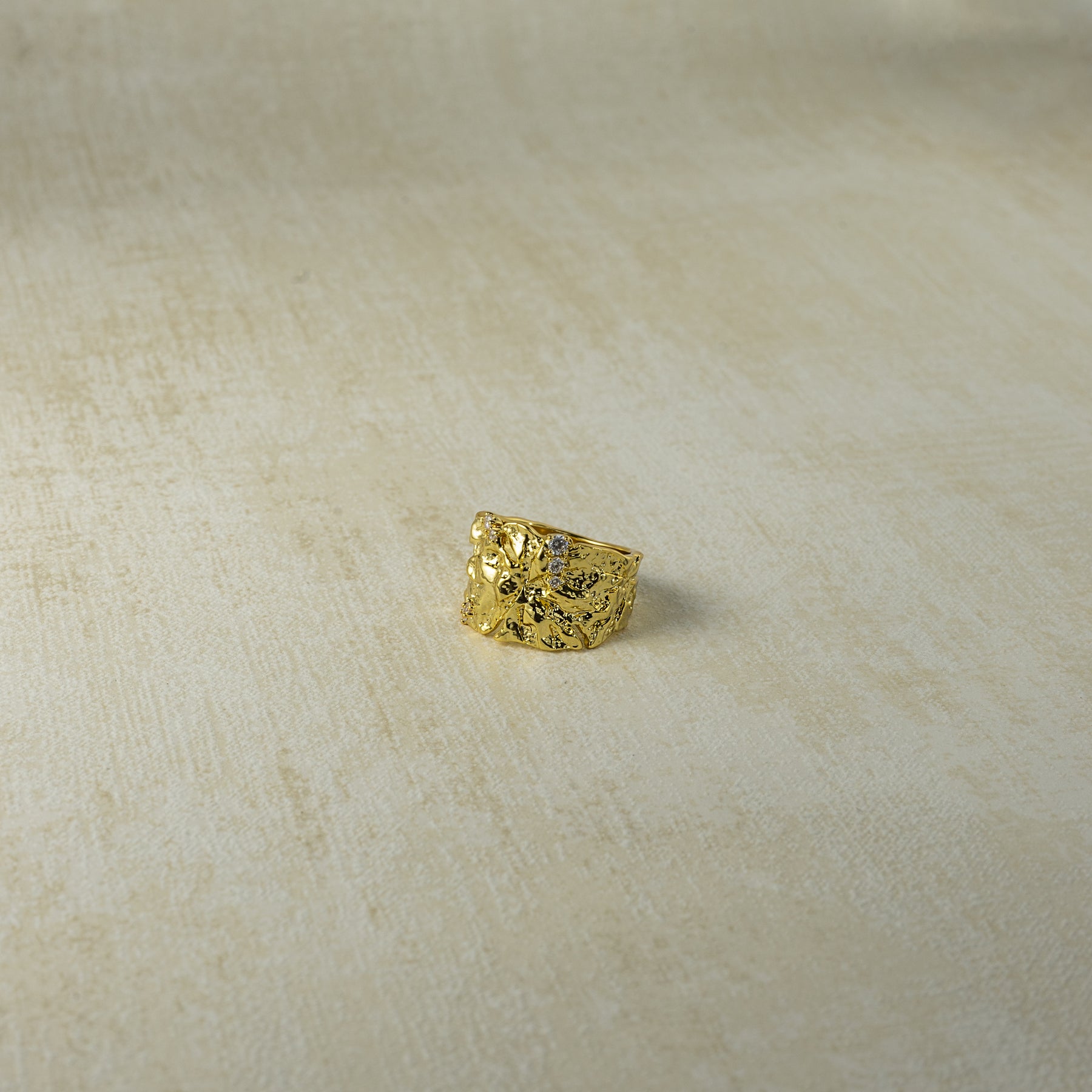 Make a bold statement with this striking ring. The unique, textured design evokes the raw beauty of natural rock formations, accented with subtly sparkling cubic zirconia. Crafted from comfortable 18K gold-plated brass.