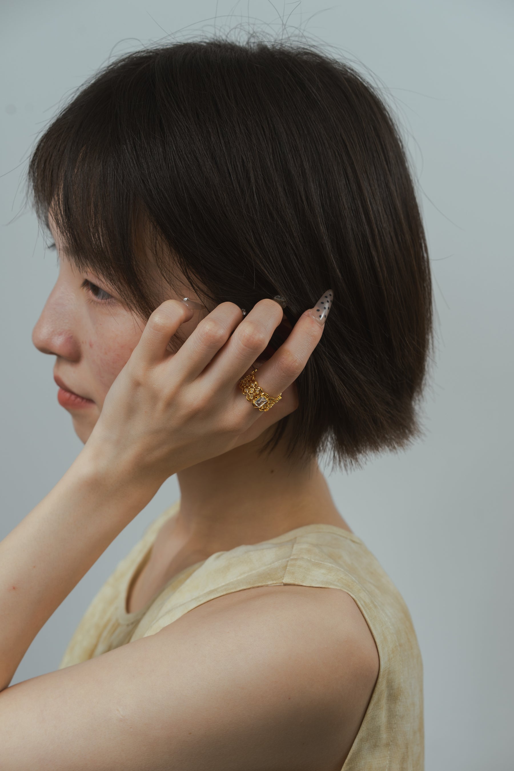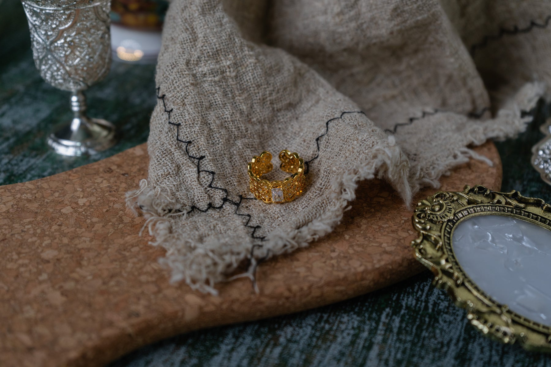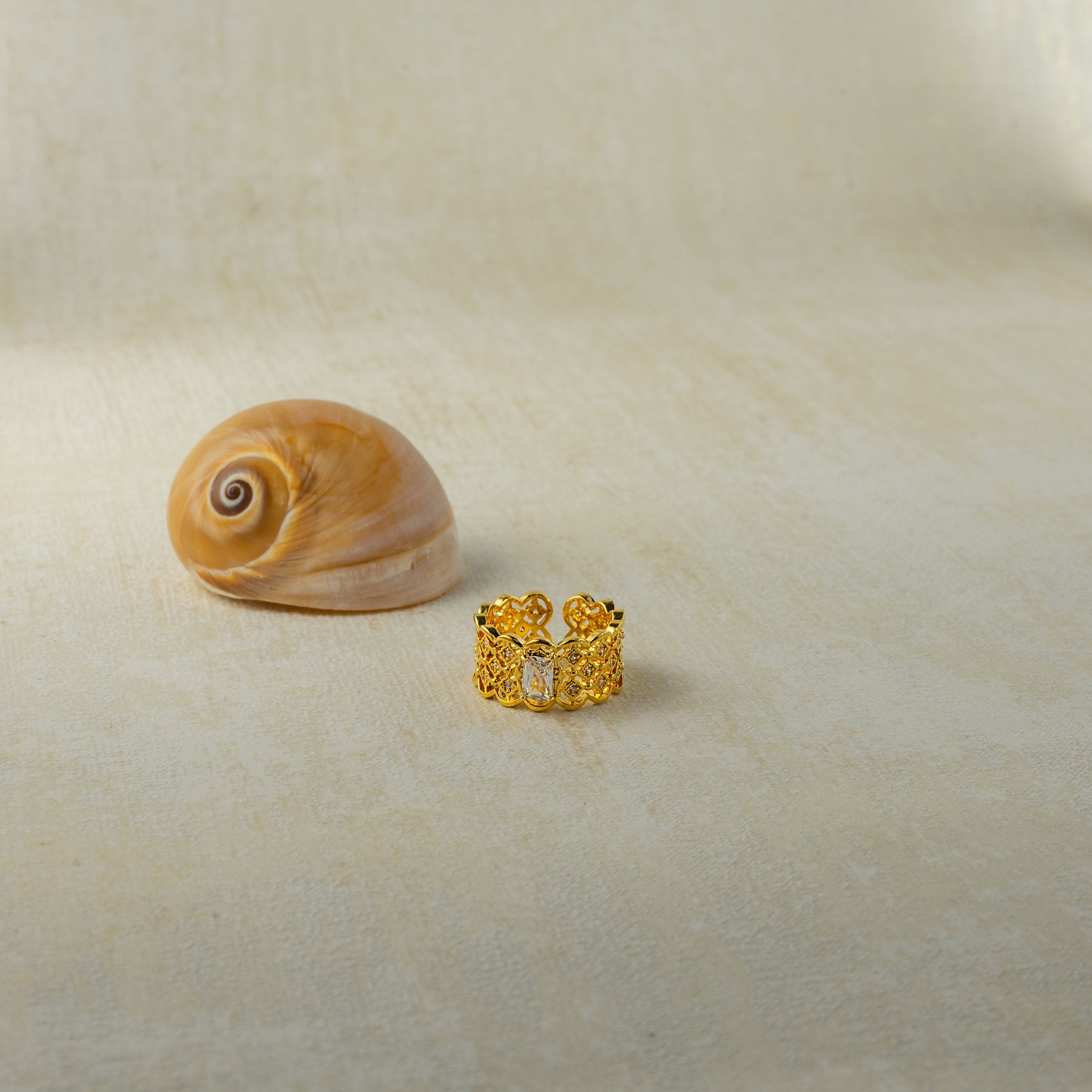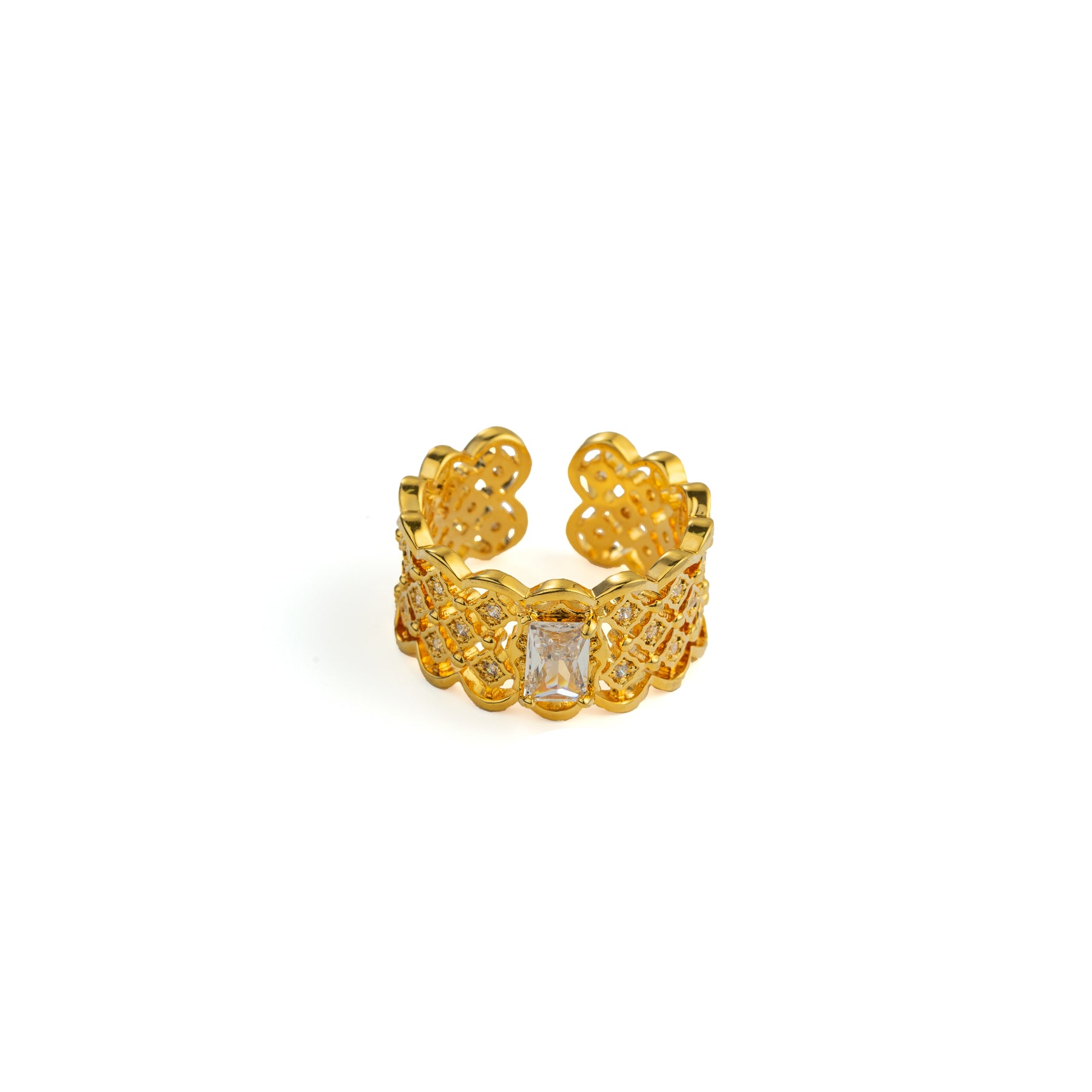 Discover a hidden beauty with this exquisite ring. Intricate openwork detailing surrounds a dazzling central cubic zirconia, creating a design that whispers of romance and mystery. Crafted from 18K gold-plated brass for a lightweight and comfortable fit.