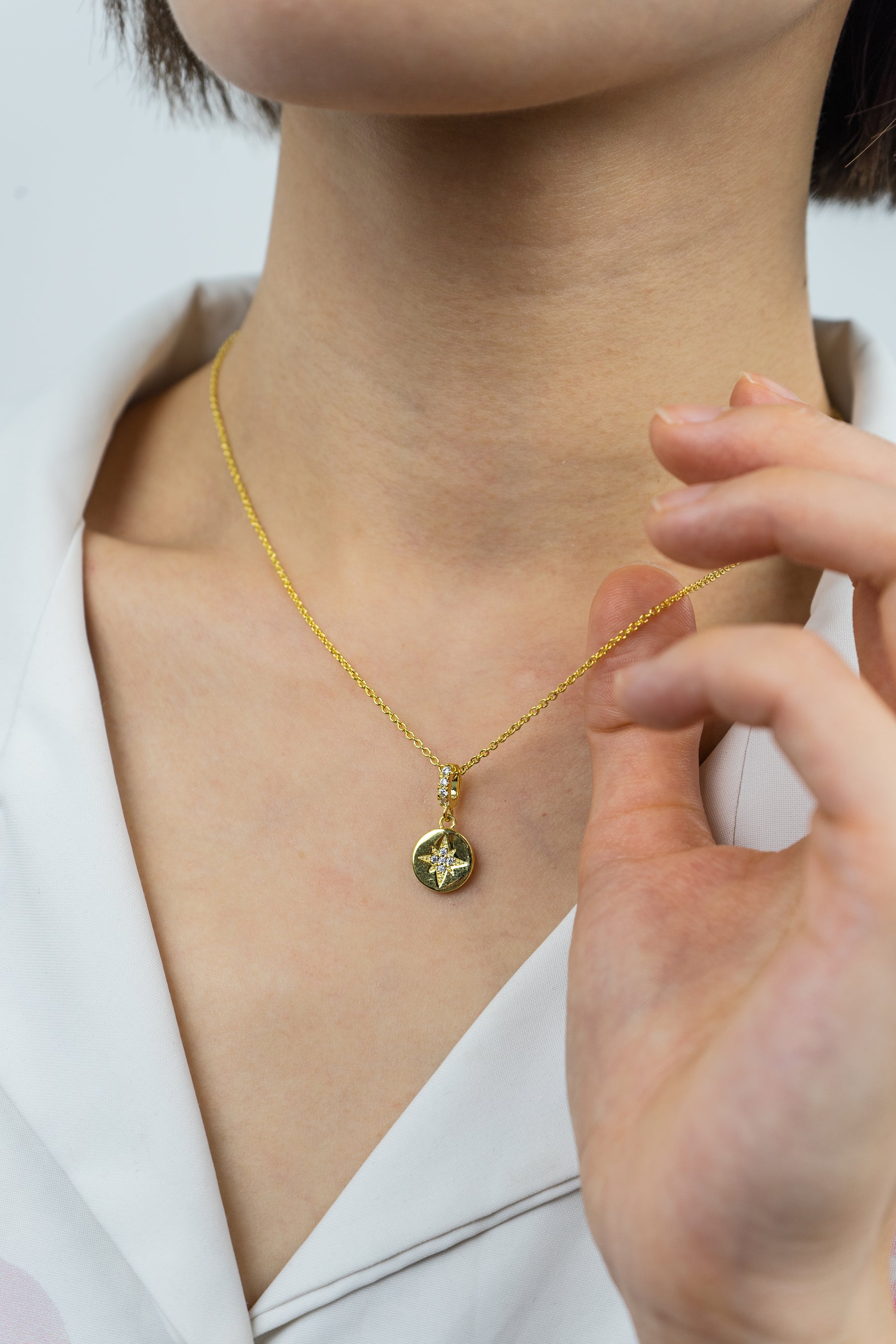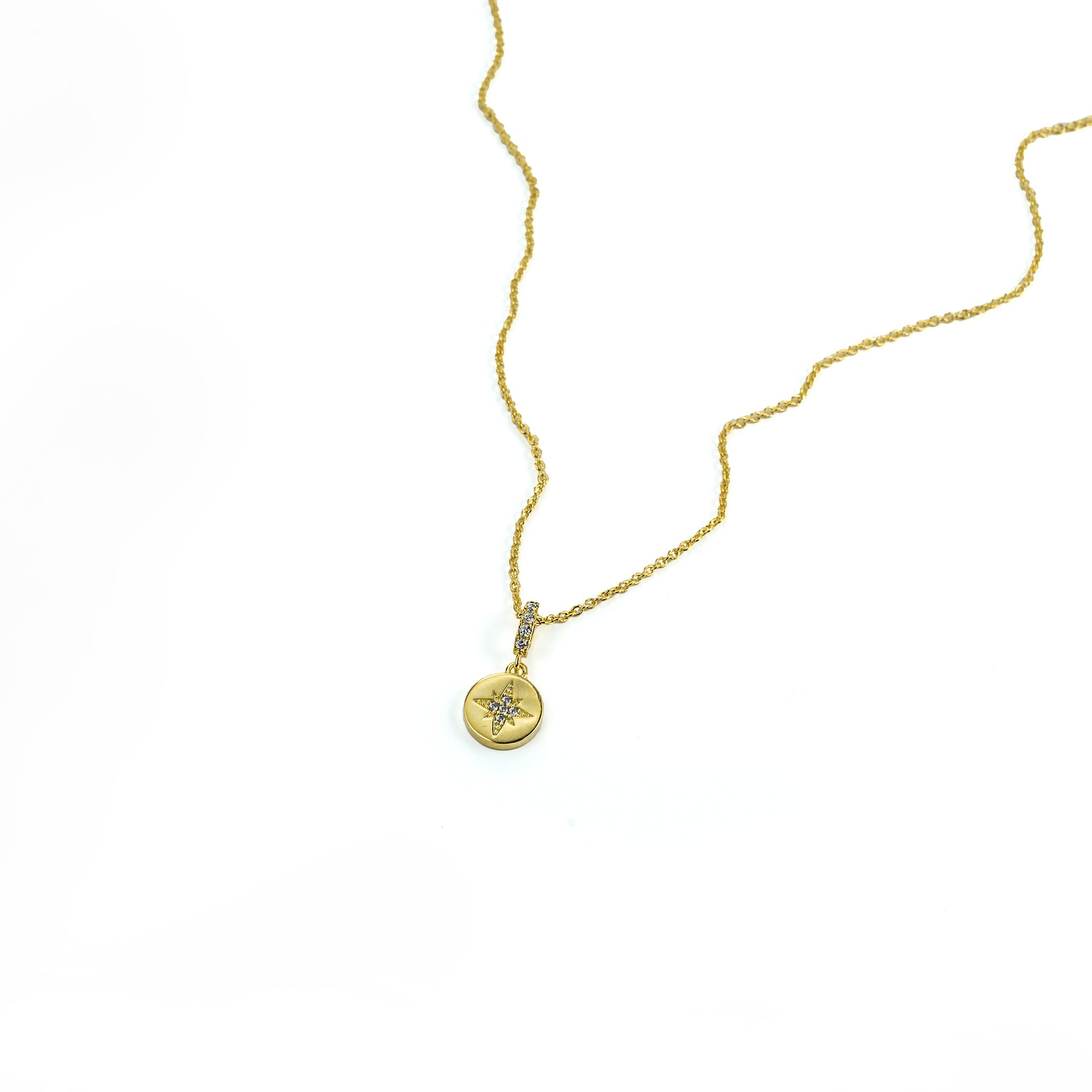 Imagine starlight captured in a delicate pendant. The Star Shine necklace, crafted from comfortable 18K gold-plated brass, features an exquisitely detailed star motif set with shimmering cubic zirconia. Each tiny stone sparkles with captivating brilliance, evoking the celestial wonder of a night sky. Wear it to add a touch of ethereal elegance and illuminate your own unique radiance.