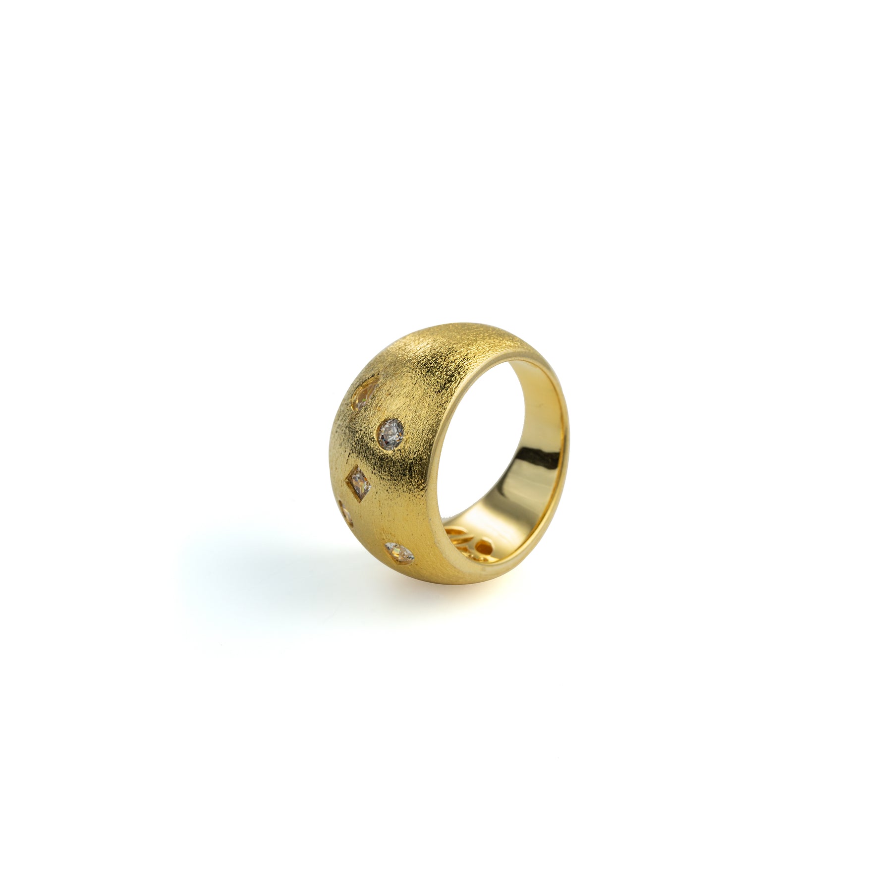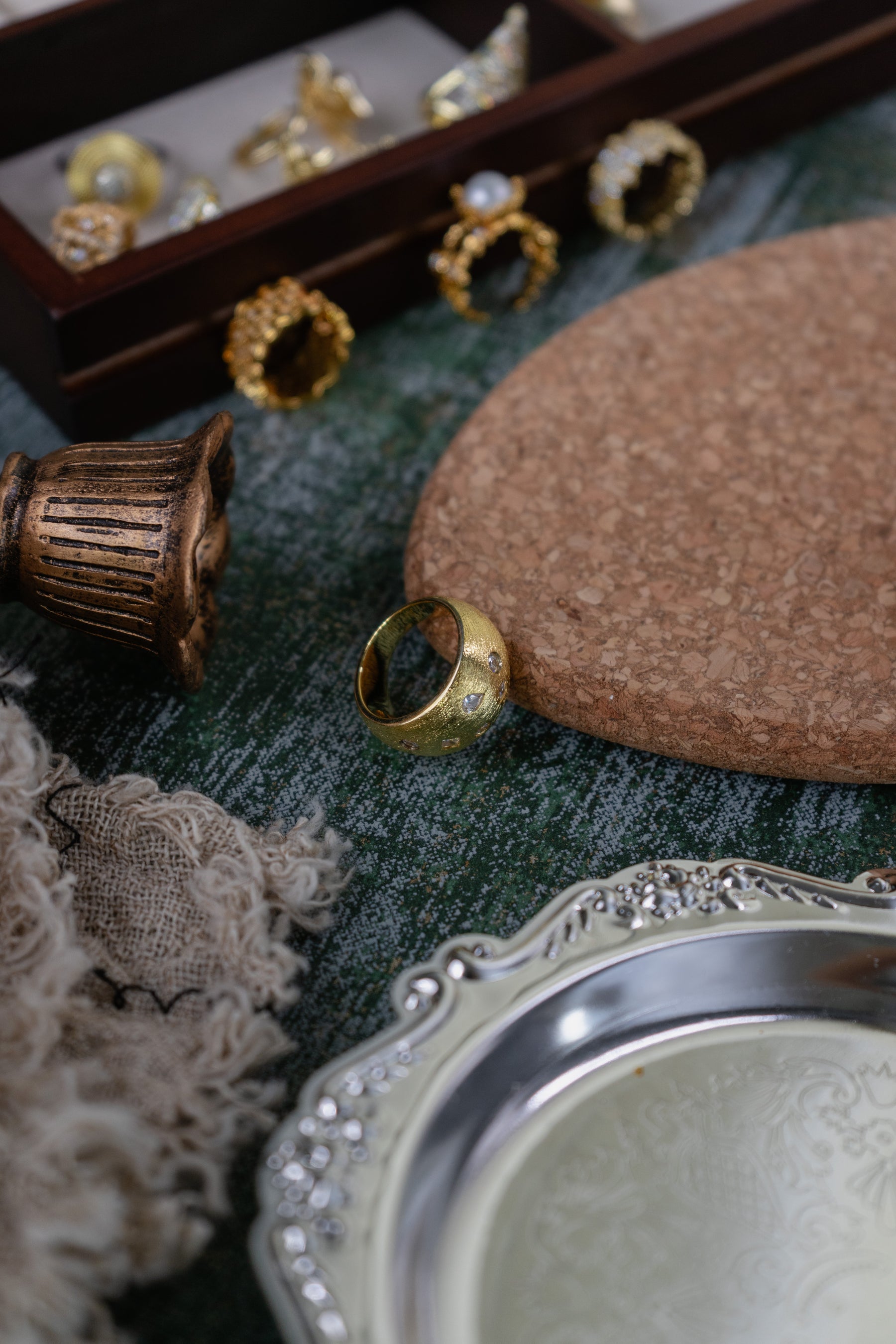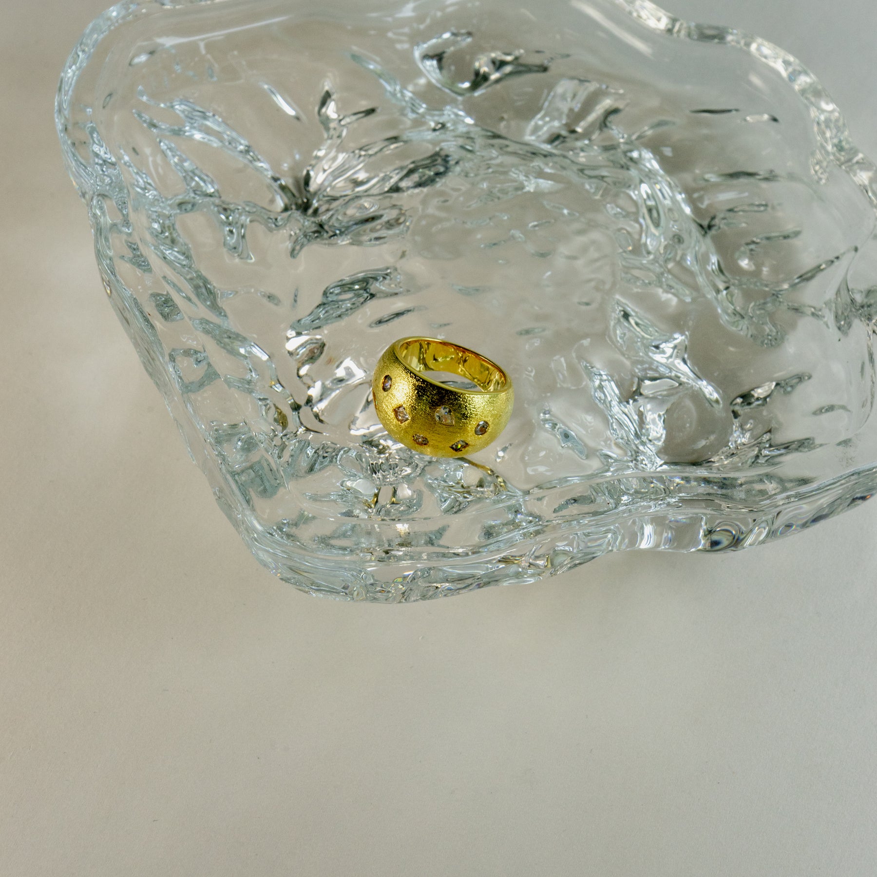 Indulge in the luxurious feel and exquisite craftsmanship of the Starry Gold Ring. Crafted from 18K gold-plated brass with a unique textured finish, this ring features shimmering cubic zirconia that evoke a starry night sky. A perfect statement piece for the discerning wearer.