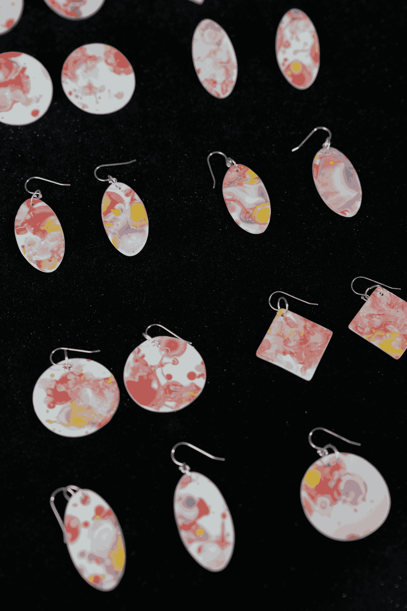 Warm hues flow like the sun melting into the horizon. Red, orange, yellow, and purple blend across glossy ceramic, capturing the fleeting beauty of sunset—light, warmth, and color lingering by your ear.